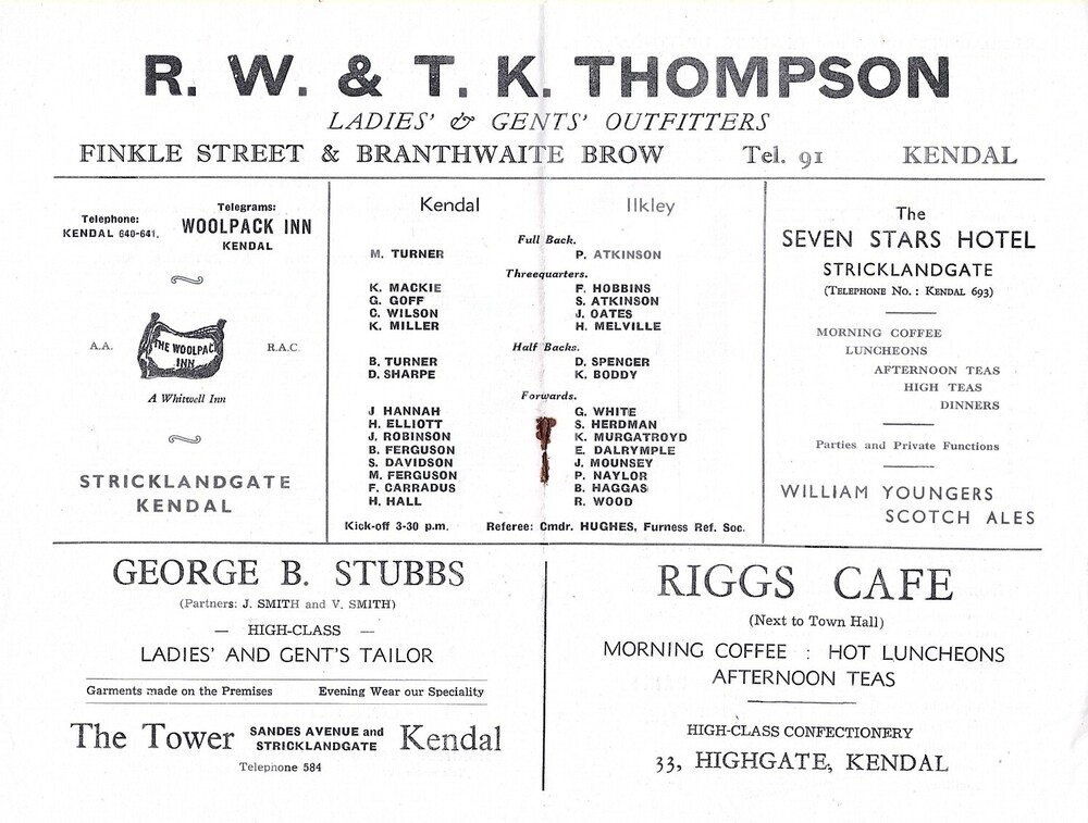 1951/52 Kendal v Ilkley Rugby Union Programme