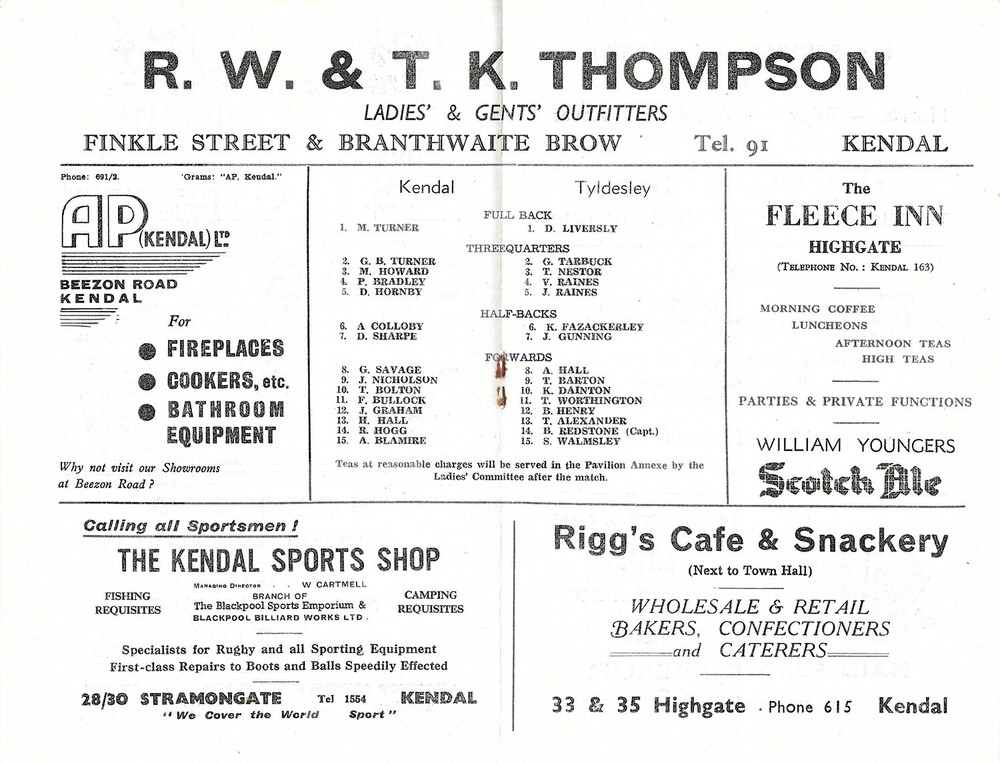 1957/58 Kendal v Tyldesley Rugby Union Programme
