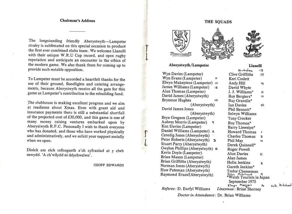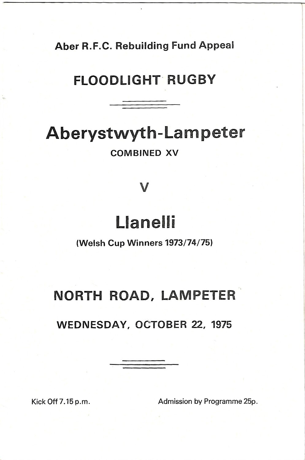 1975/76 Aberystwyth-Lampeter Combined XV v Llanelli (22/10/1975) Aber R.F.C Rebuilding Fund Appeal Rugby Union Programme