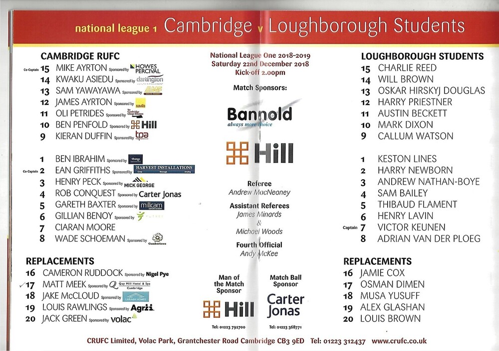 2018/19 Cambridge v Loughborough Students (22/11/2018) Rugby Union Programme