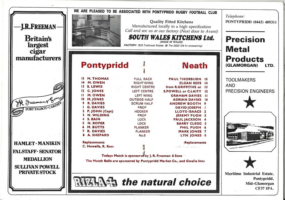 1987/88 Pontypridd v Neath Rugby Union Programme