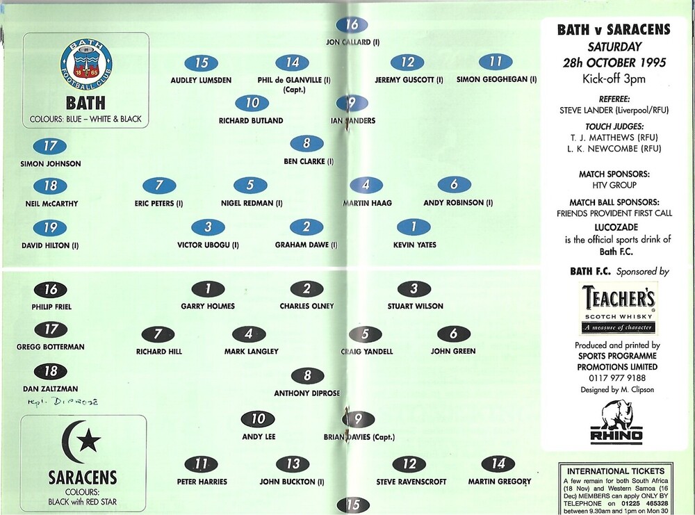 1995/96 Bath v Saracens (28/10/1995) Rugby Union Programme