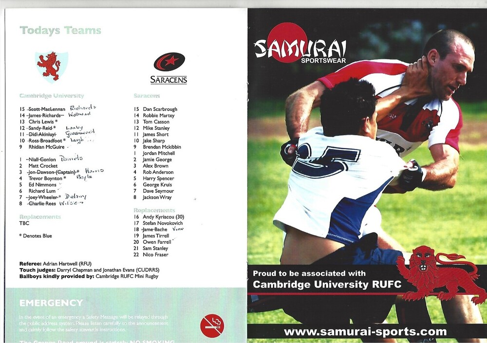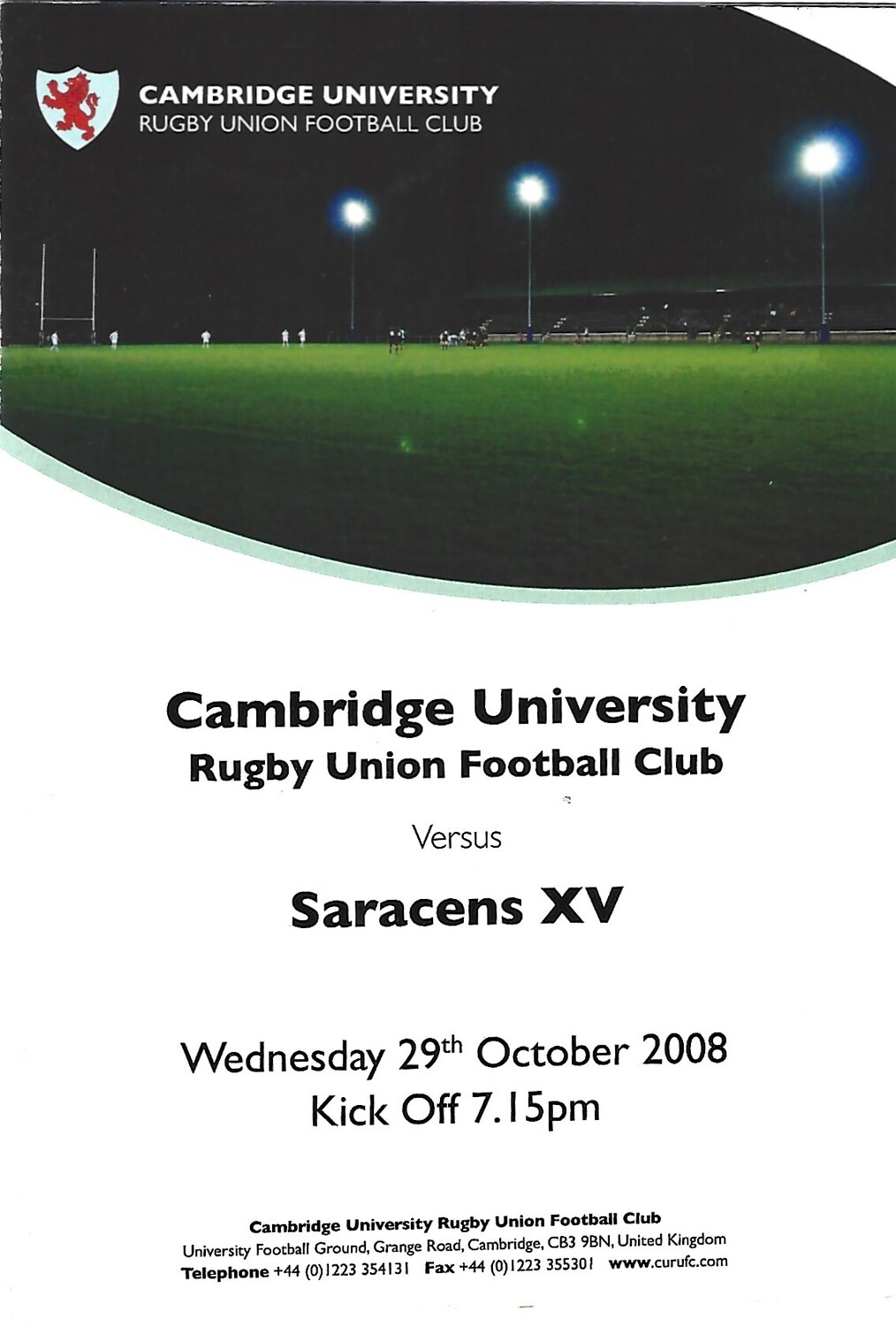 2008/09 Cambridge University v Saracens XV (29/10/2008) Rugby Union Programme