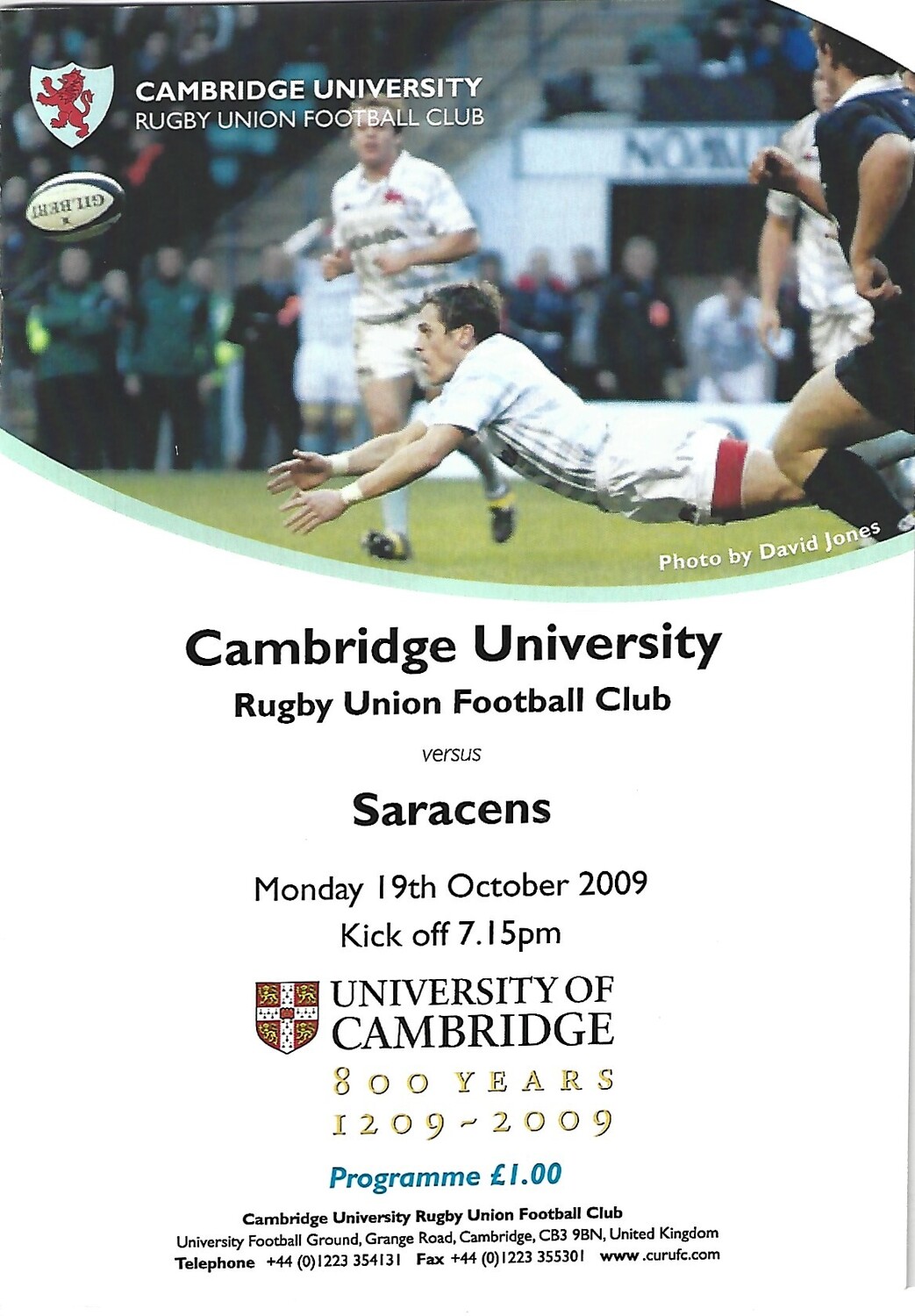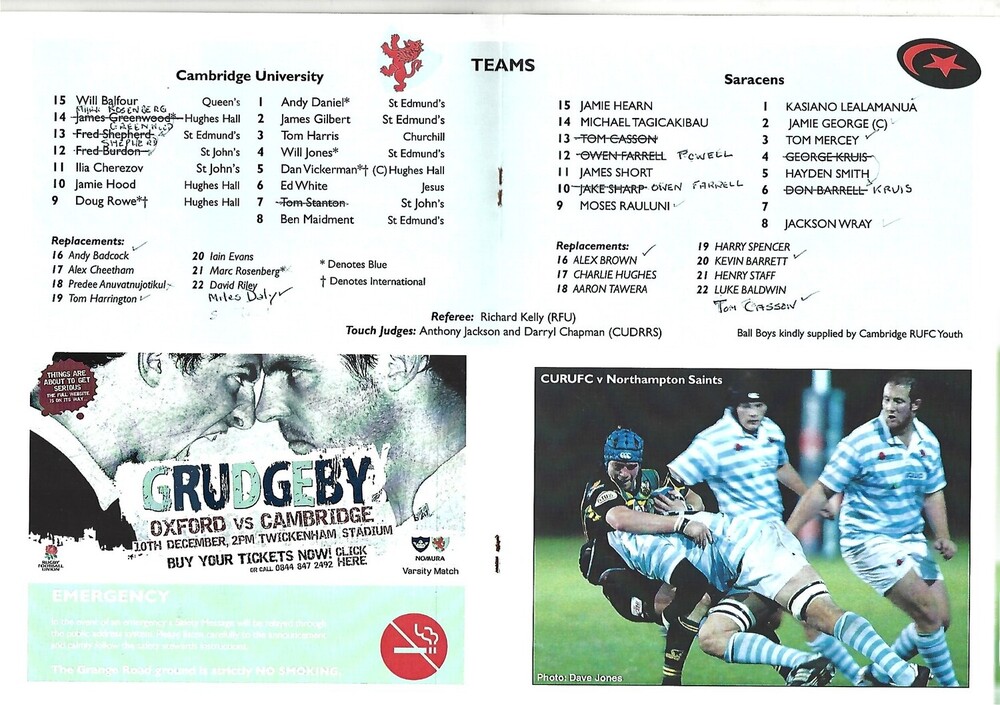2009/10 Cambridge University v Saracens (19/10/2009) Rugby Union Programme