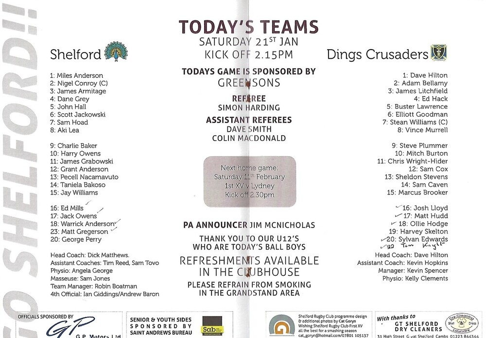 2011/12 Shelford v Dings Crusaders (21/01/2012) Rugby Union Programme