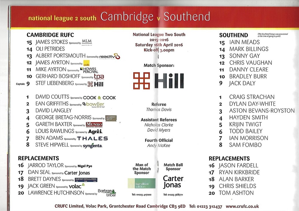 2015/16 Cambridge v Southend (16/04/2016) Rugby Union Programme