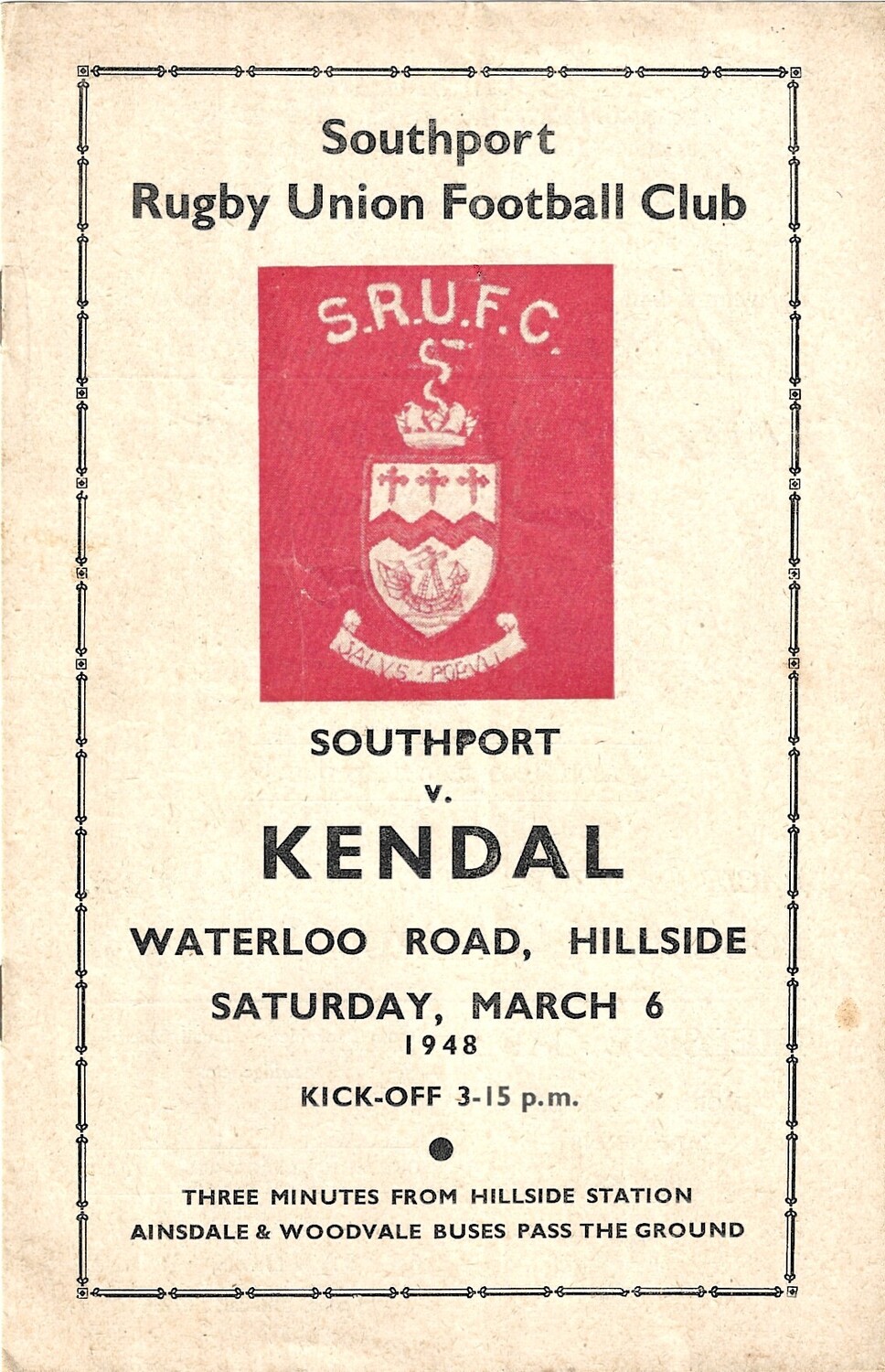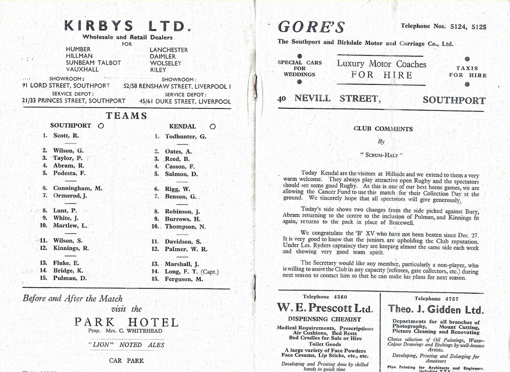1947/48 Southport v Kendal Rugby Union Programme