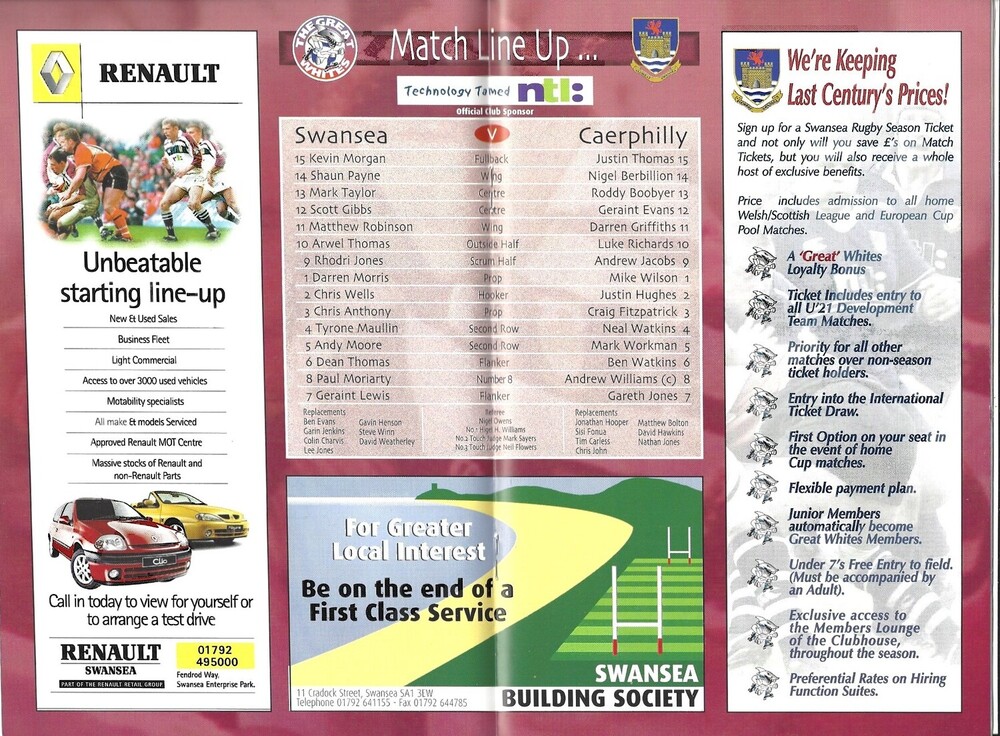 2000/01 Swansea v Caerphilly Rugby Union Programme