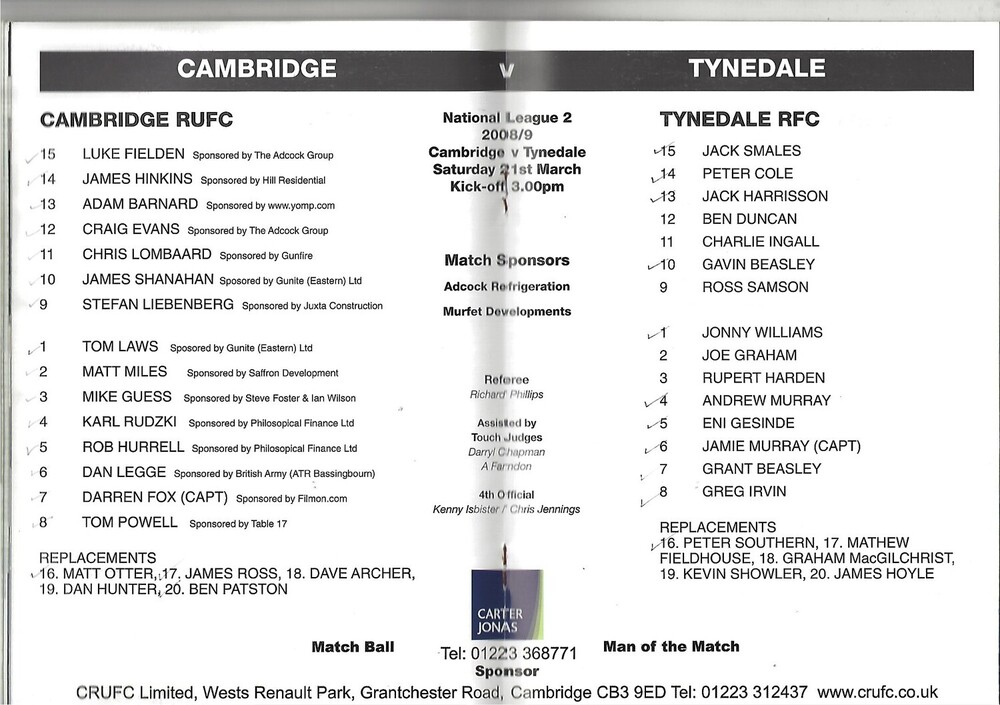 2008/09 Cambridge v Tynedale (21/03/2009) Rugby Union Programme