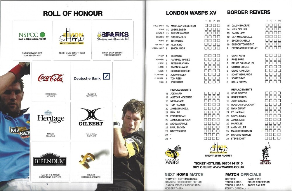 2006/07 London Wasps v Borders Reivers (in support of Simon Shaw's benefit year) Rugby Union Programme
