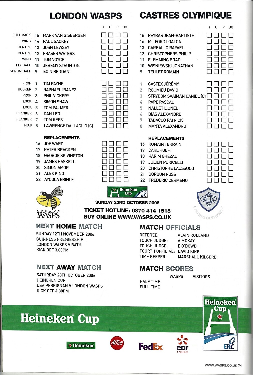 2006/07 London Wasps v Castres Olympique Heineken Cup 1st Round Rugby Union Programme