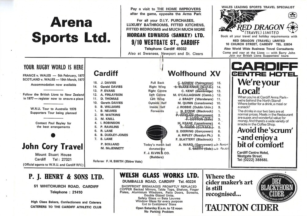 1976/77 Cardiff v Wolfhound XV (11/09/1976) Rugby Union Programme