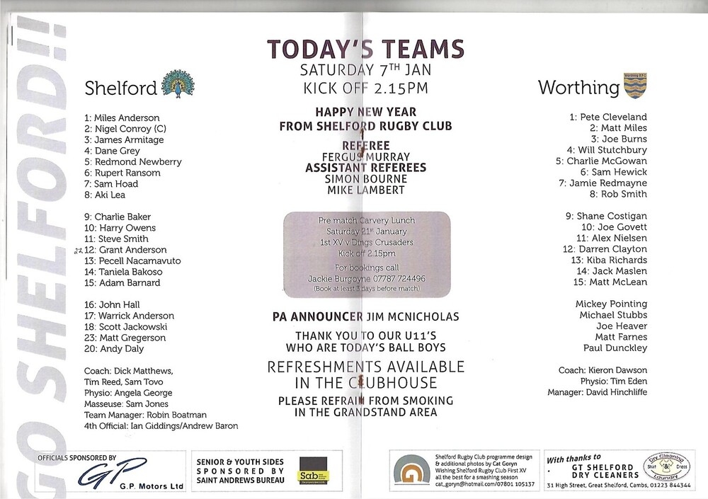 2011/12 Shelford v Worthing (07/01/2012) Rugby Union Programme