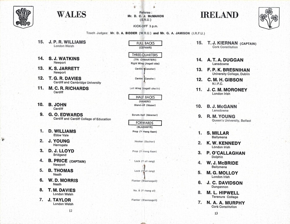 1969 Wales v Ireland 5 Nations Rugby Union Programme