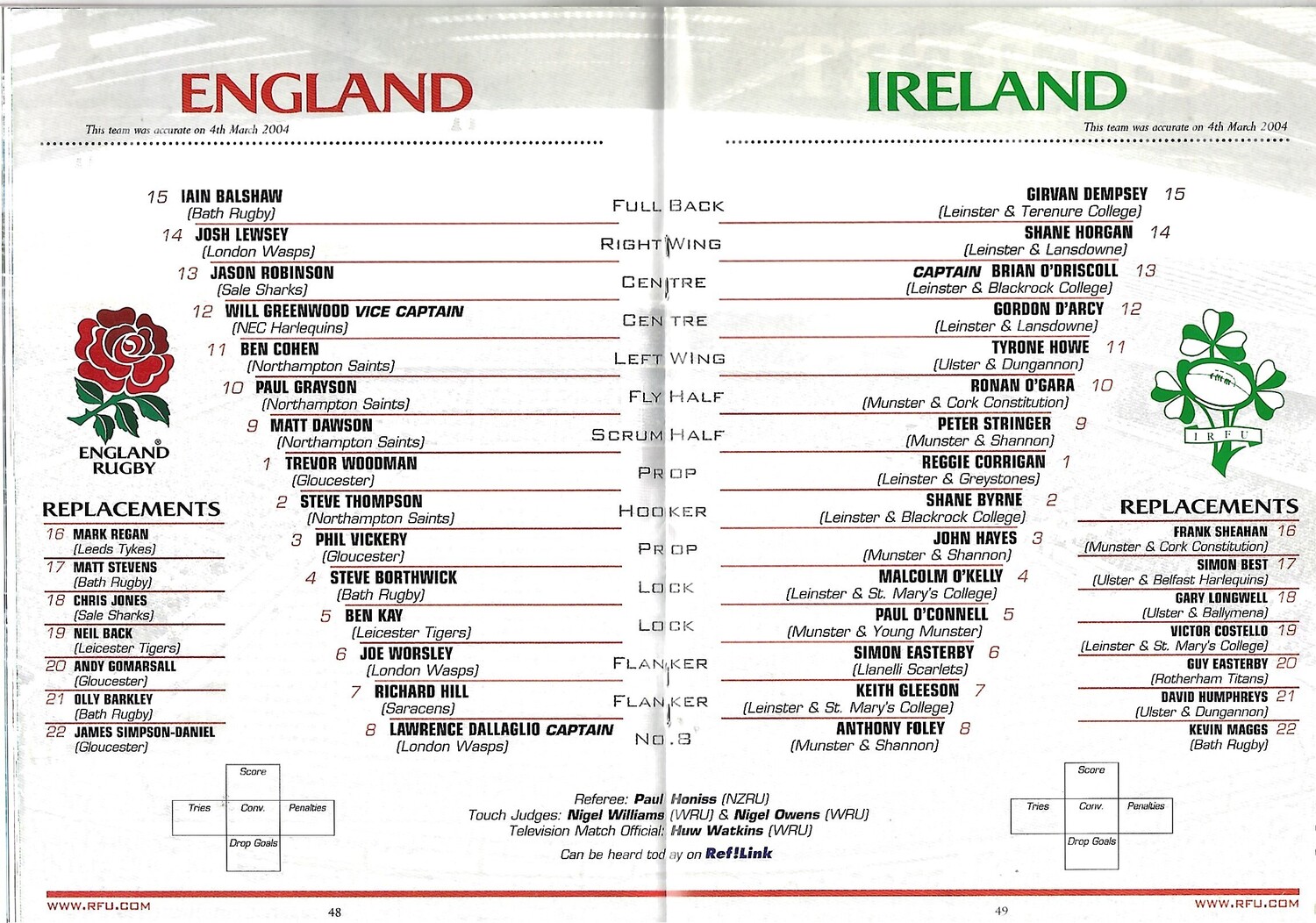 2004 England v Ireland (06/03/2004) Six Nations Rugby Union Programme