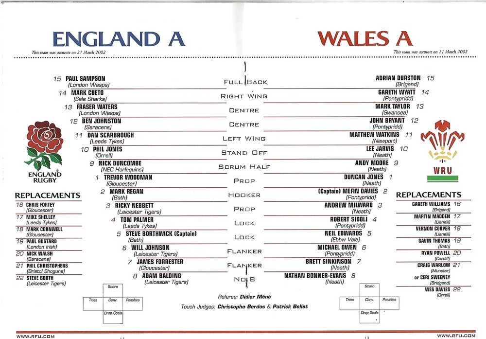 2002 England A v Wales A International Rugby Union Programme