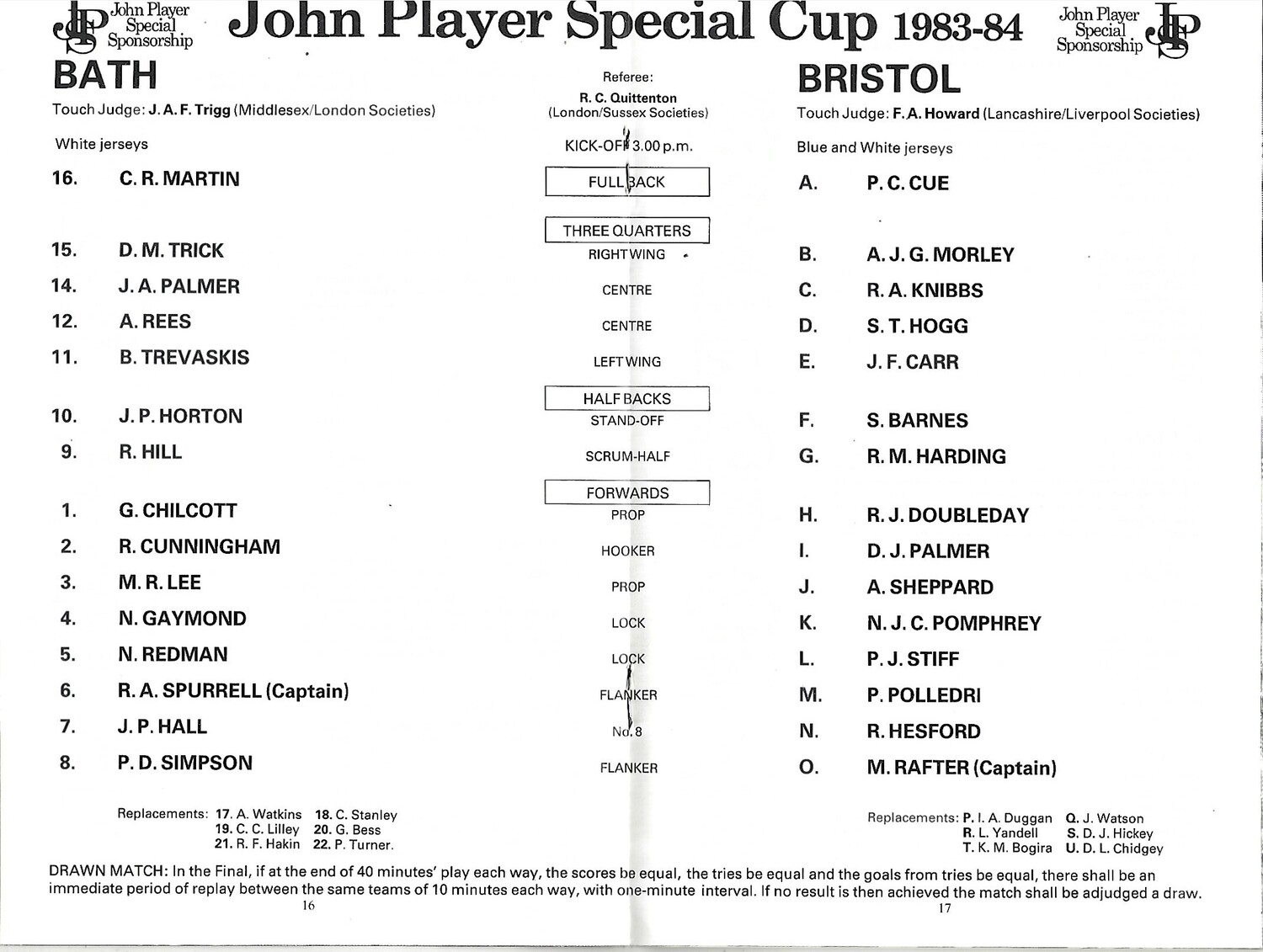 1984 Bath v Bristol John Player Cup Final Rugby Union Programme