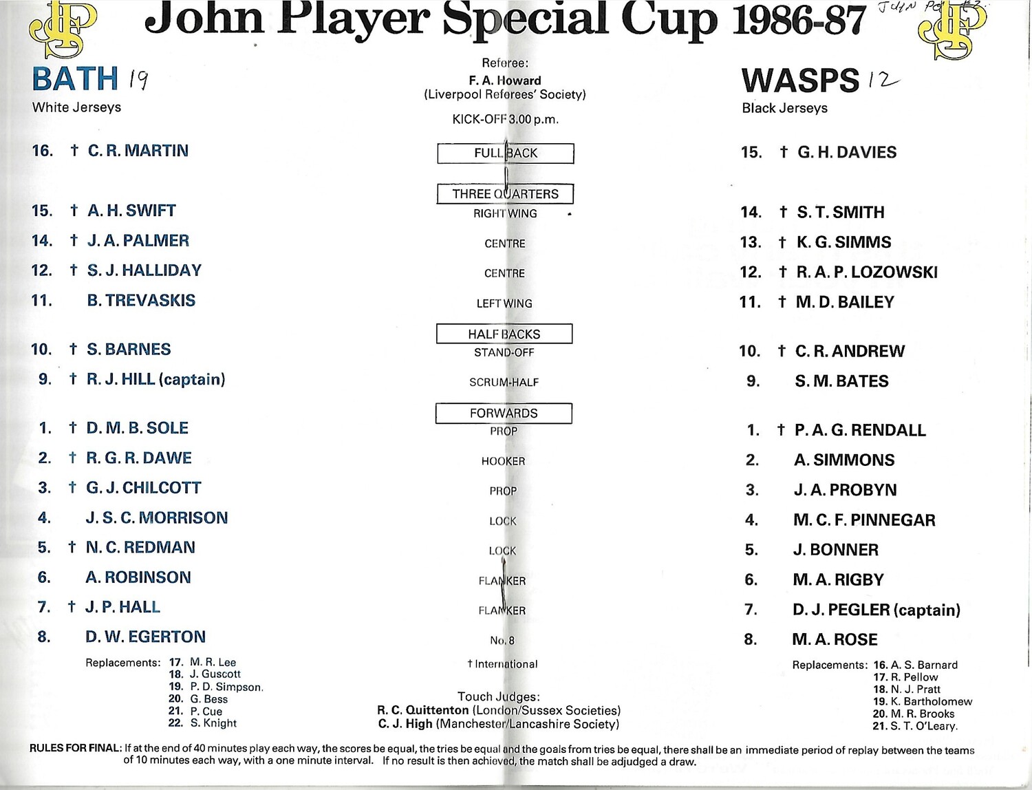 1987 Bath v Wasps John Player Cup Final Rugby Union Programme