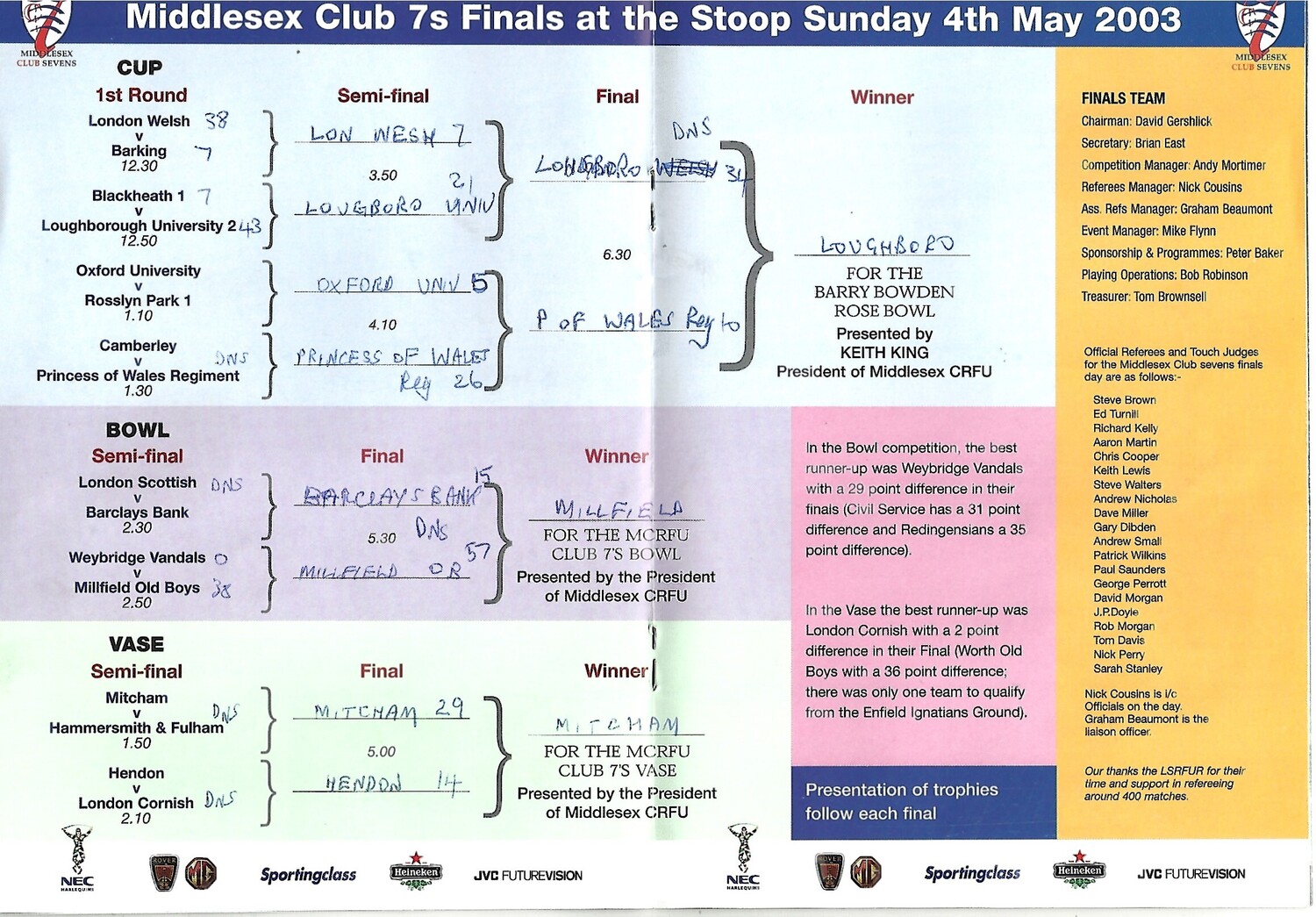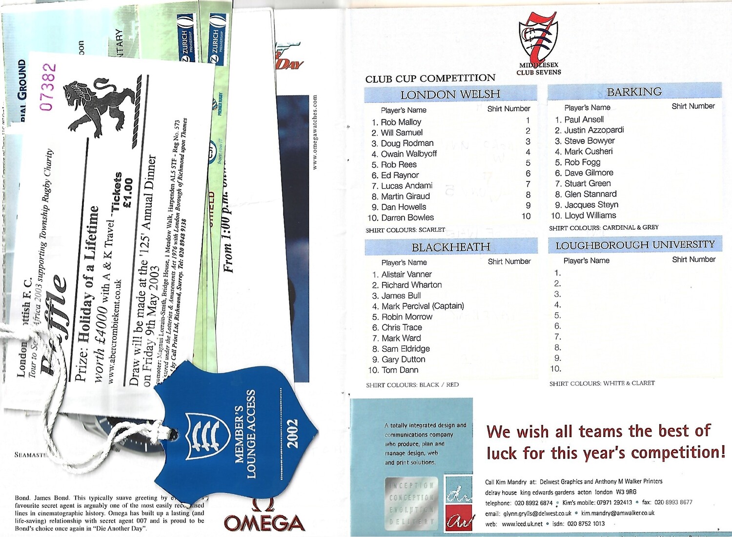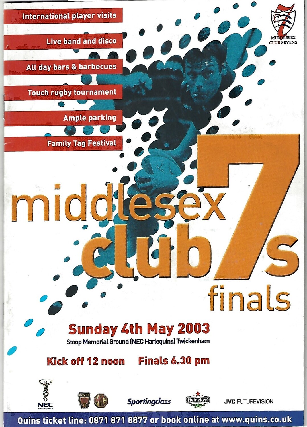 2003 Middlesex Club Sevens Rugby Union Programme & Match Ticket