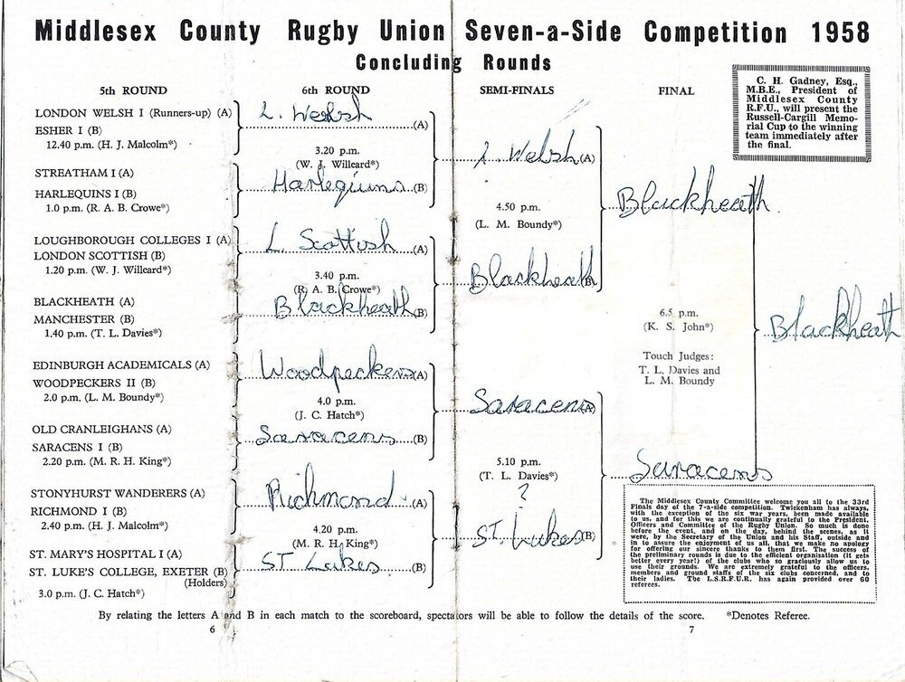 1958 Middlesex Sevens Rugby Union Programme
