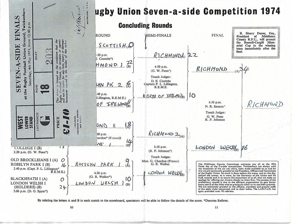 1974 Middlesex Sevens Rugby Union Programme & Match Ticket