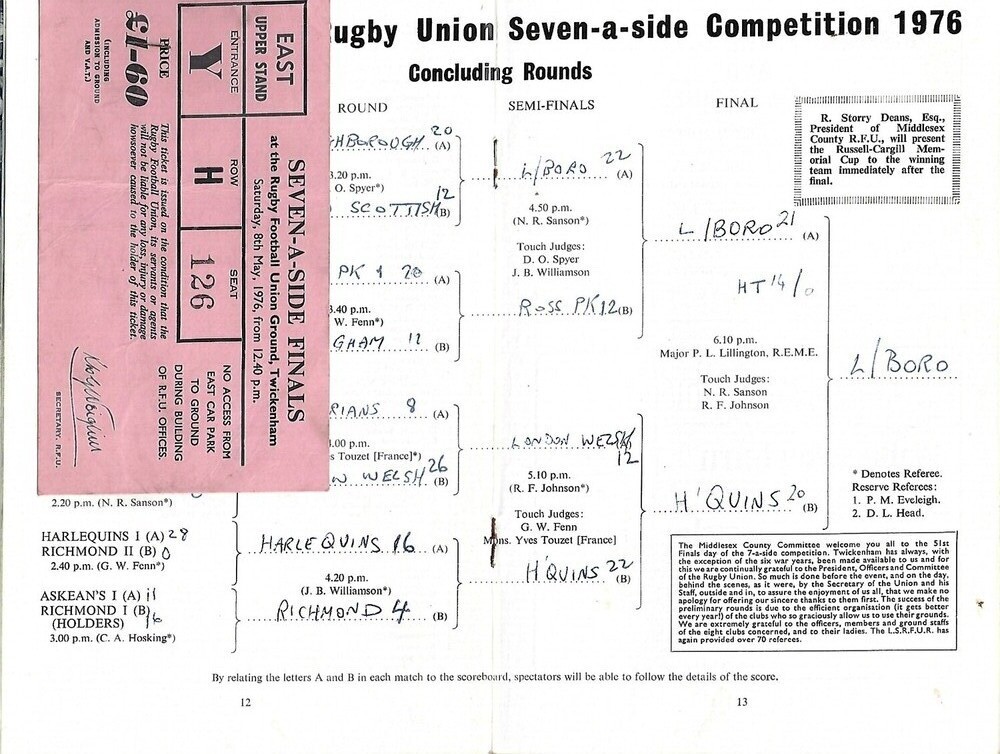 1976 Middlesex Sevens Rugby Union Programme & Match Ticket