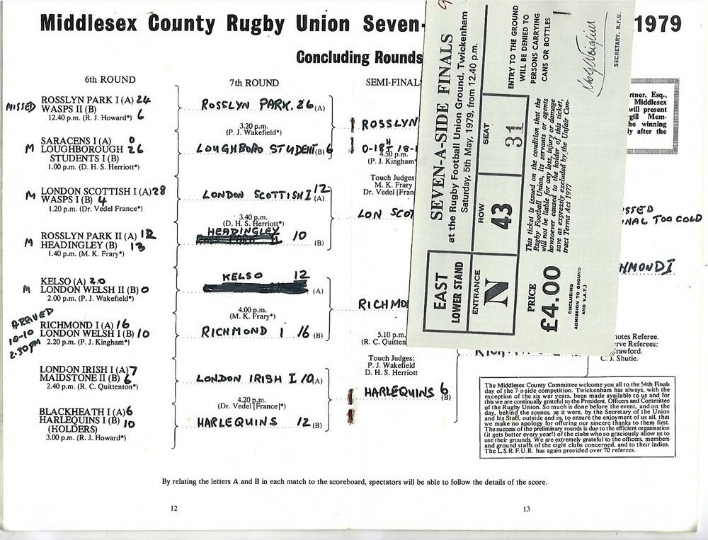 1979 Middlesex Sevens Rugby Union Programme & Match Ticket