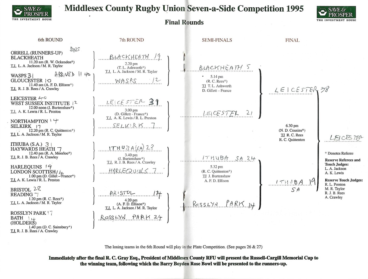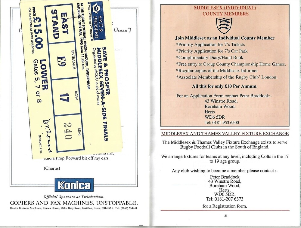 1995 Middlesex Sevens Rugby Union Programme & Match Ticket