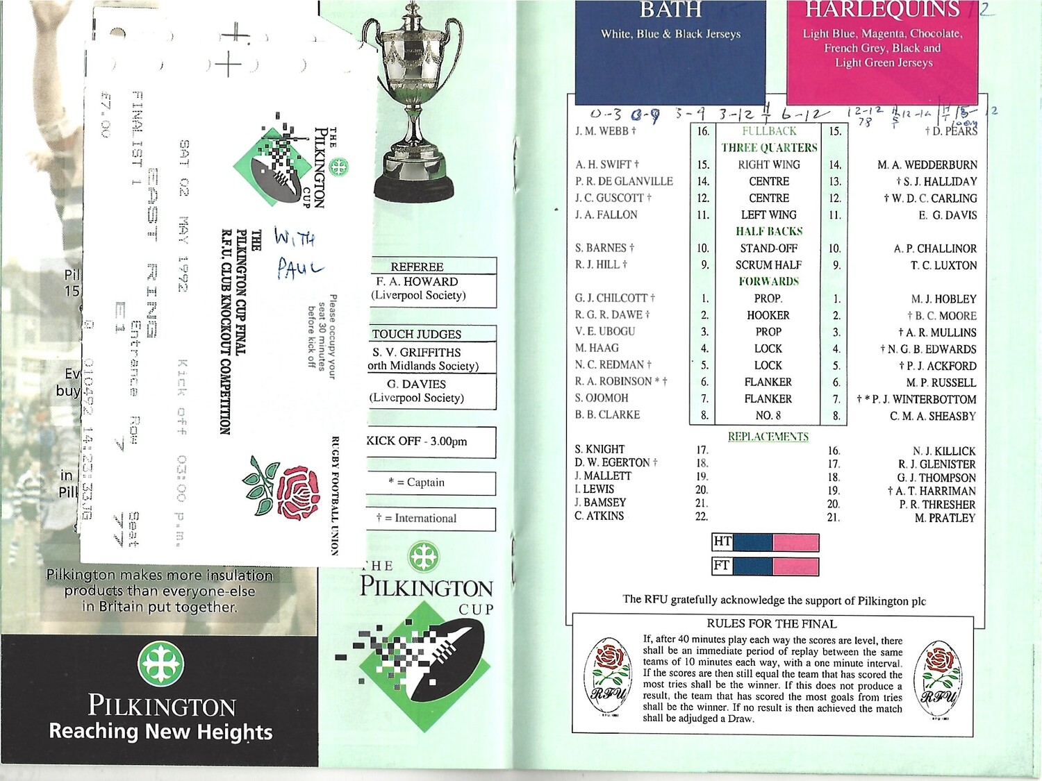 1992 Bath v Harlequins Pilkington Cup Final Rugby Union Programme & Match Ticket
