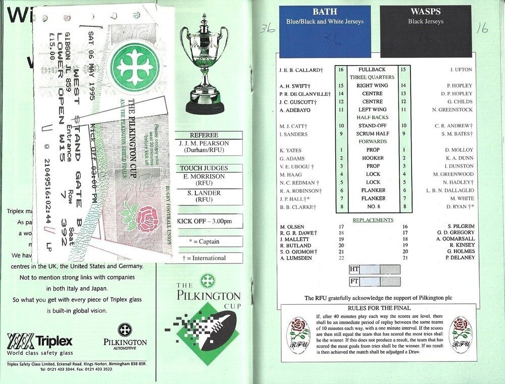 1995 Bath v Wasps Pilkington Cup Final Rugby Union Programme & Match Ticket