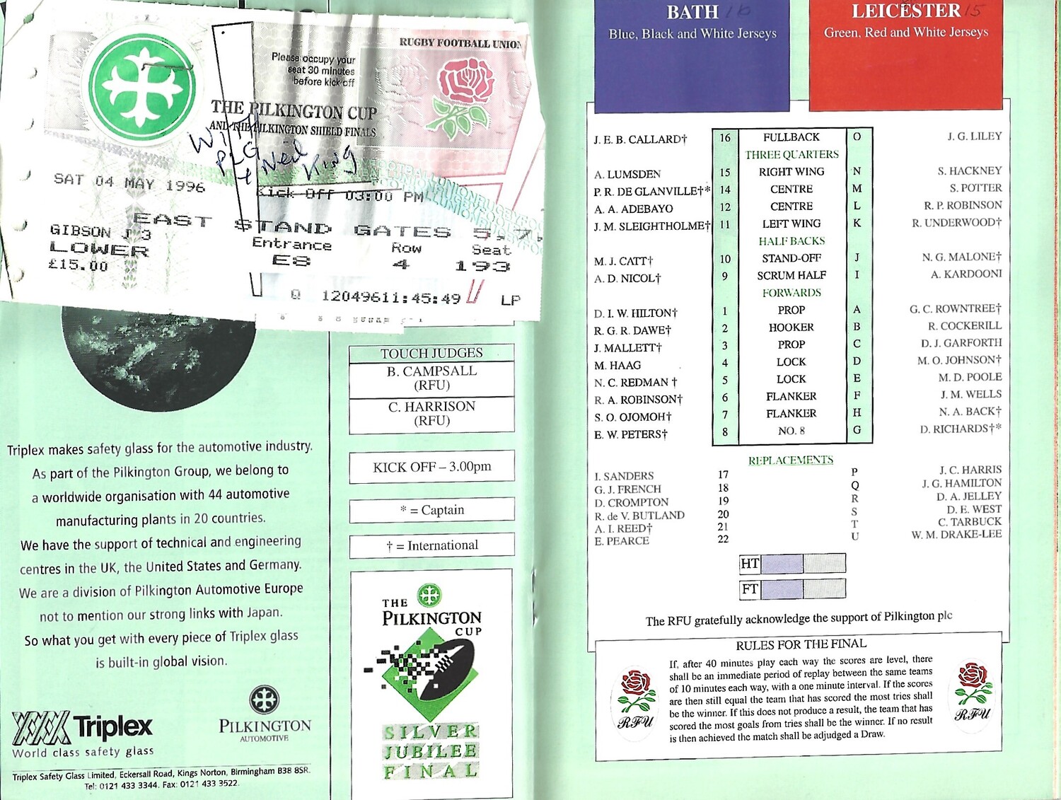 1996 Bath v Leicester Pilkington Cup Final Rugby Union Programme & Match Ticket