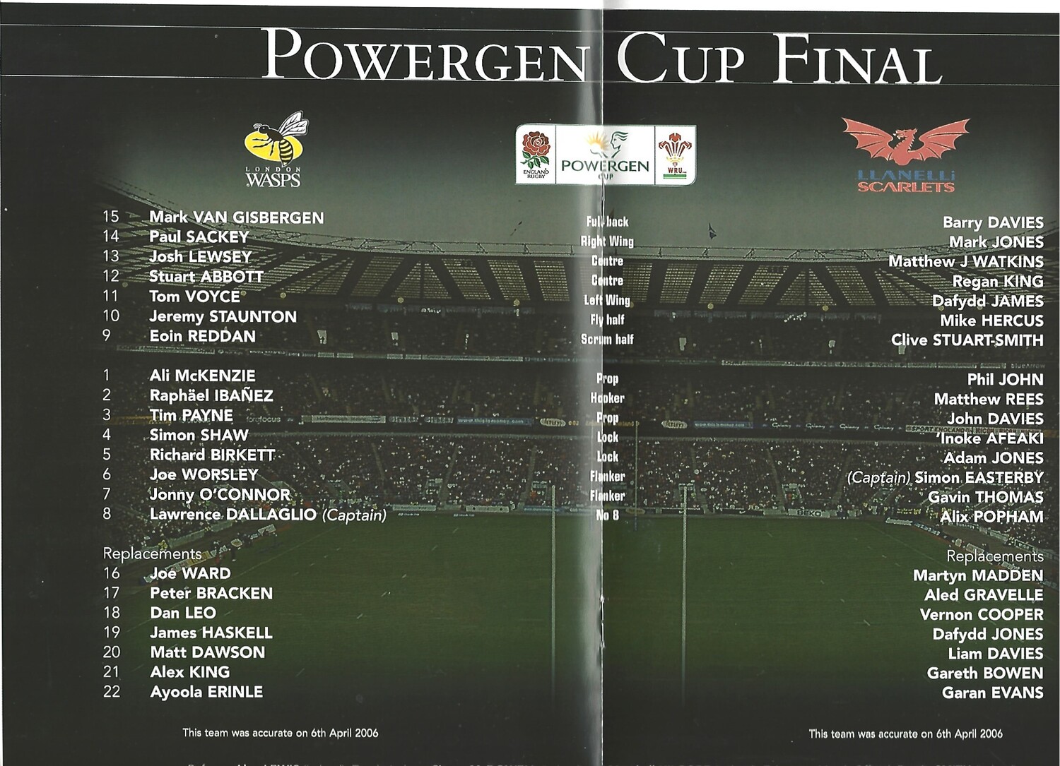 2006 London Wasps v Llanelli Scarlets Powergen Cup Final Rugby Union Programme