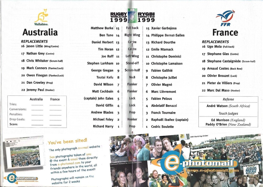 1999 Australia v France Rugby World Cup Final Rugby Union Programme