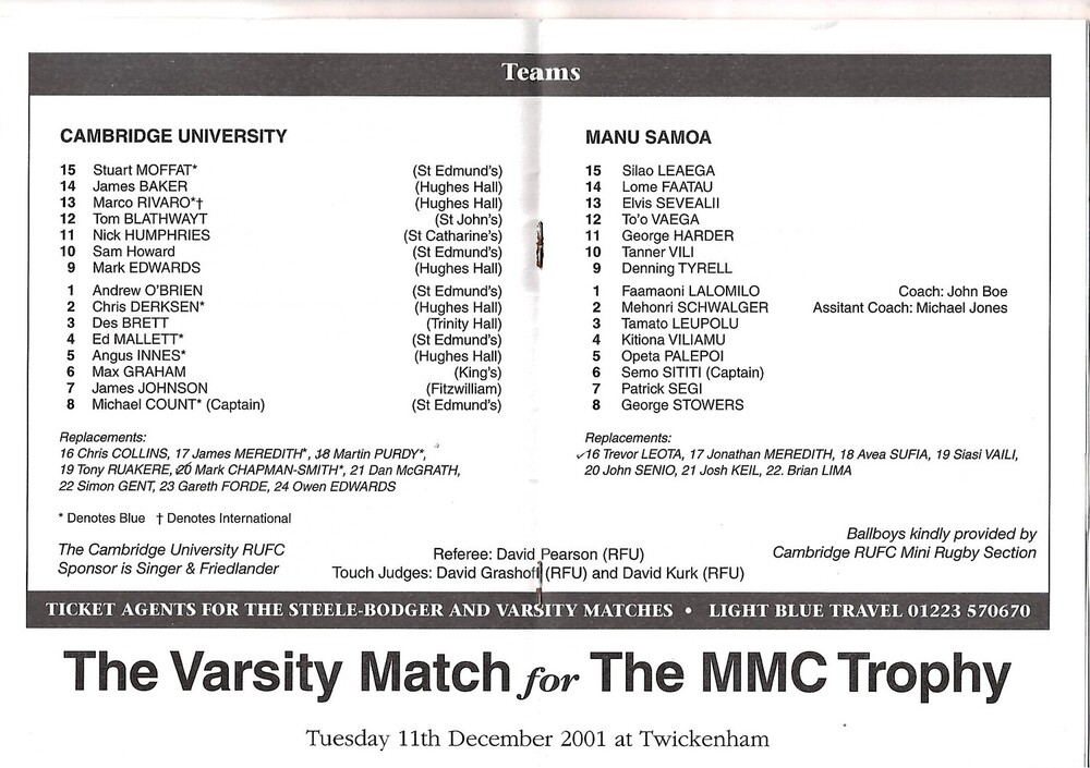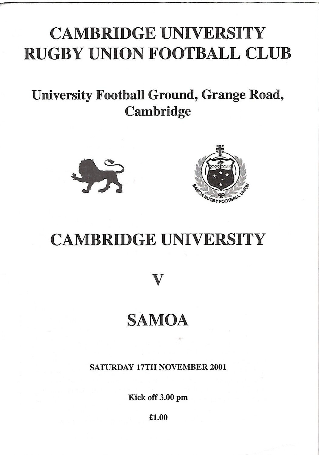 2001/02 Cambridge University v Samoa Tour Match (17/11/2001) Rugby Union Programme